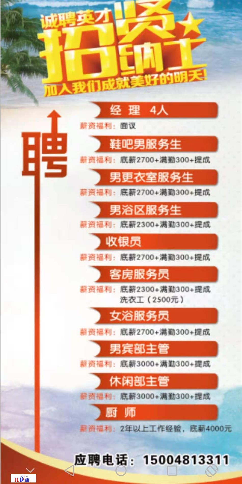 扎赉特旗大型洗浴宾馆现诚聘以下工作人员:
