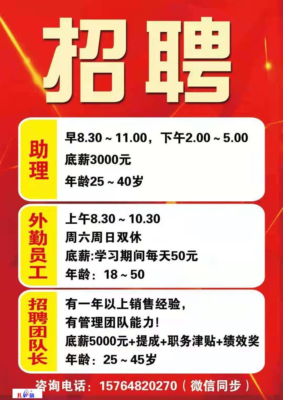 招聘助理和外勤助理早8.30~11.00下午2.00~5.00底薪3000元年龄25~40岁外勤员工上午8.30~10.30周六周日双休底薪:学习期间每天50元年龄:18~50招聘团队长有一年以上销售经验,有管理团队能力底薪5000元+提成+职务津贴+绩效奖年龄:25~45岁咨询270